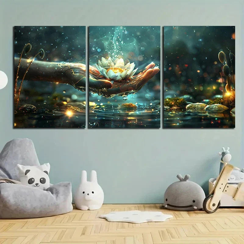 3pcs Flower On Palm Nature White Metal Print Ready to Hang Art
