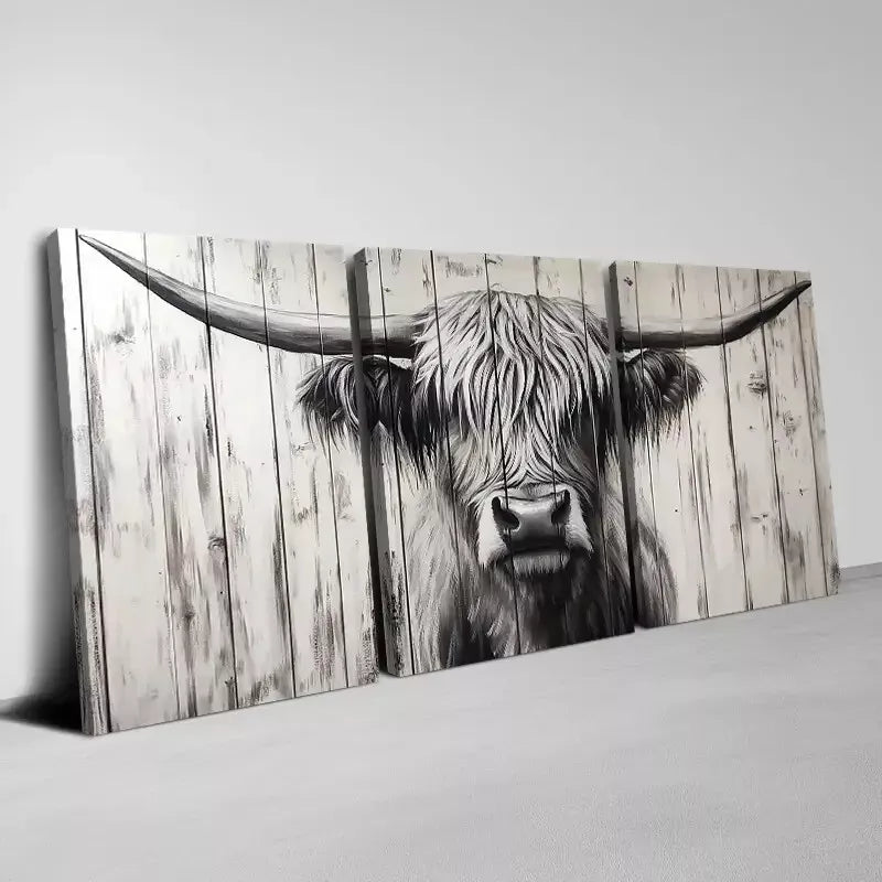 3pcs Friendly Vintage Style Highland Cattle Wall Art Set Canvas Framed 40x60cm - High Quality Print 100% Australian Made Wall Canvas Ready to Hang