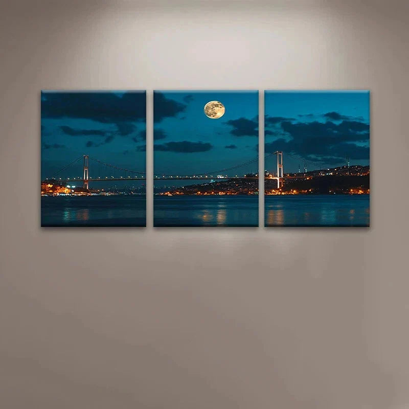 3pcs Full Moon & City Lights Bosphorus Night Scene Metal Print Ready to Hang Art