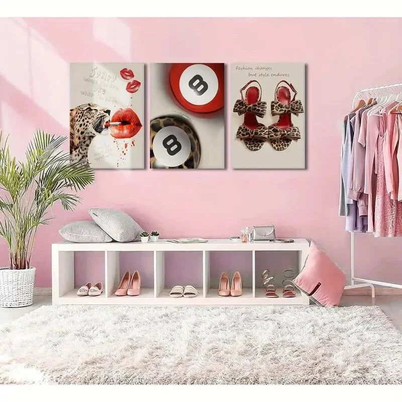 3pcs Funky Lucky 8 Ball, High Heels, and Lips Metal Print Ready to Hang Art