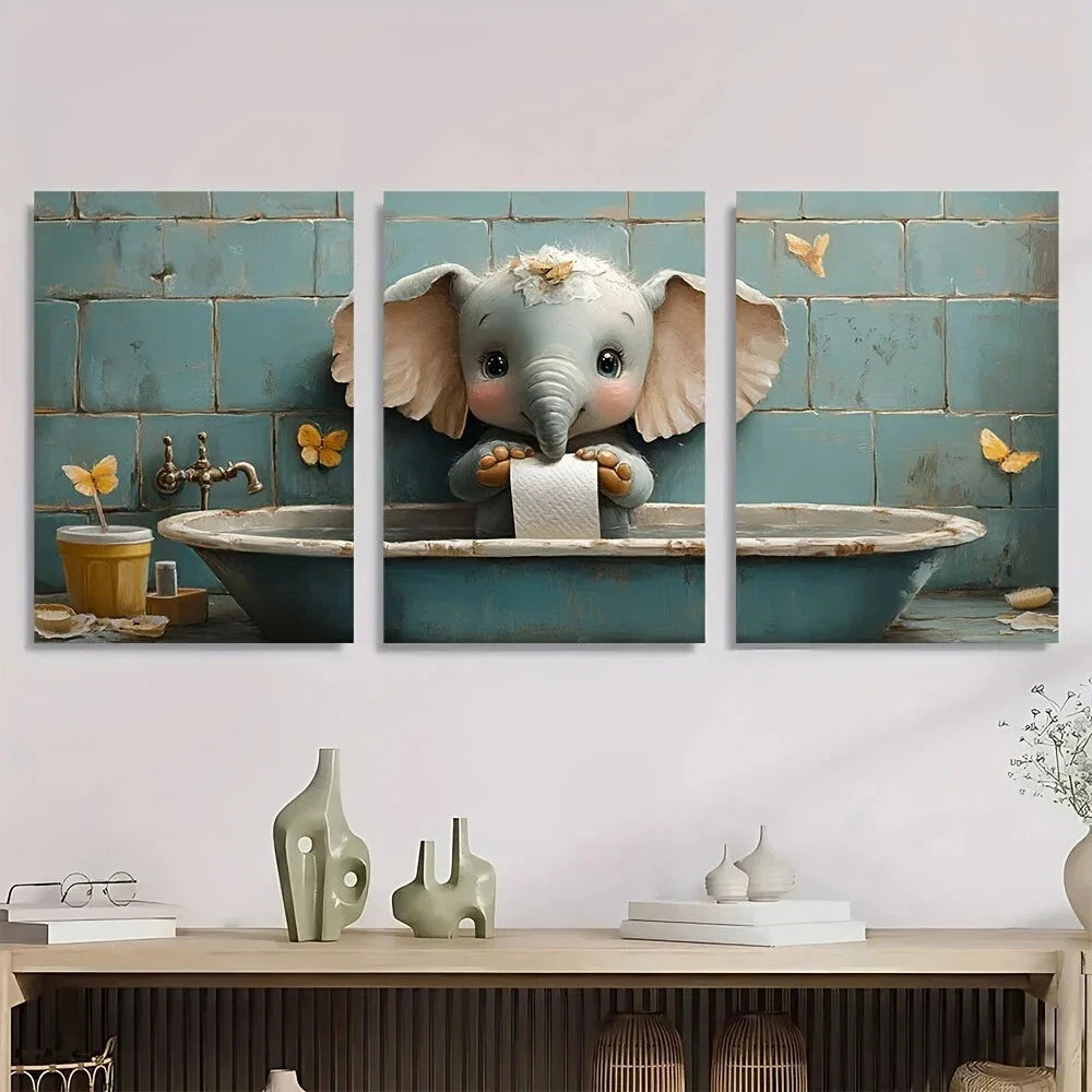 3pcs Funny Elephant Whimsical Toilet Paper Metal Print Ready to Hang Art