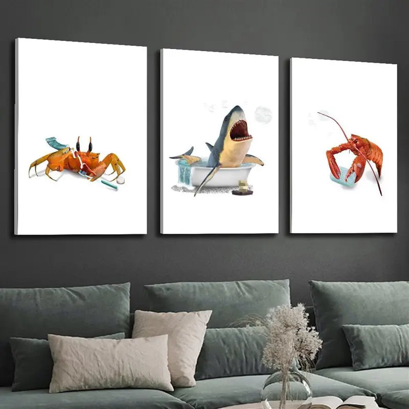 3pcs Funny Shark, Cute Crab & Coastal Lobster Metal Print Ready to Hang Art