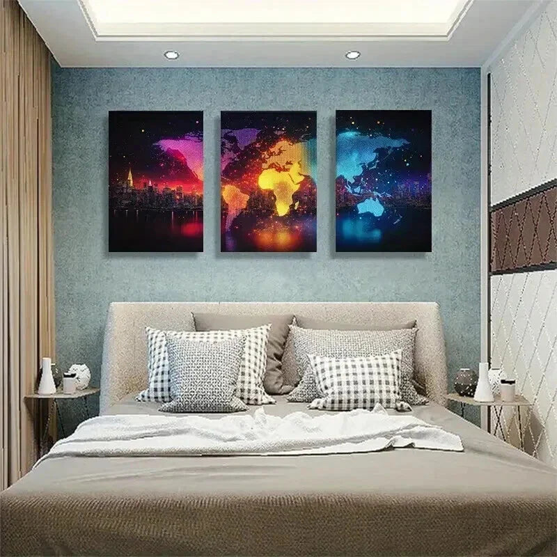 3pcs Geometric World Map with Cityscapes Perfect Wall Art Set Canvas Framed 40x60cm - High Quality Print 100% Australian Made Wall Canvas Ready to Hang