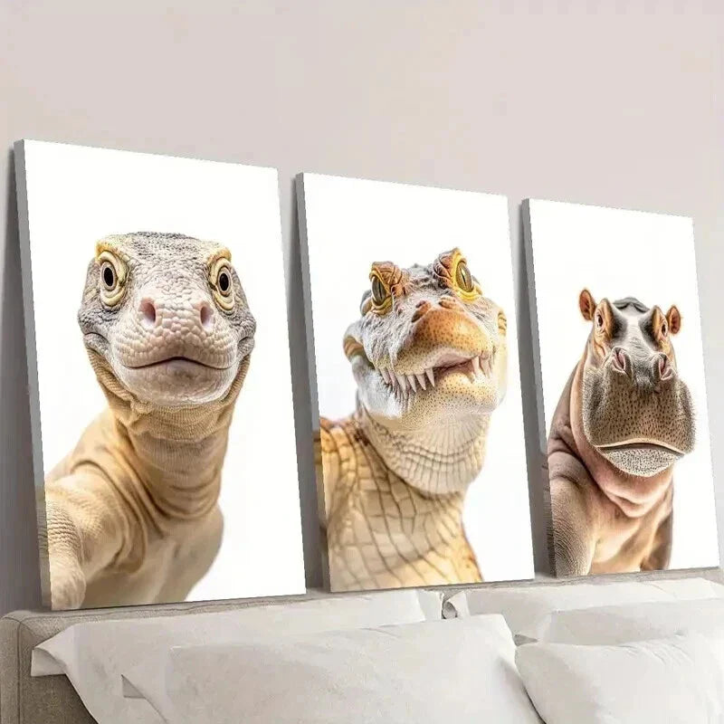 3pcs Giant Lizard Crocodile and Hippo Heads Wall Art Set Canvas Framed 40x60cm - High Quality Print 100% Australian Made Wall Canvas Ready to Hang