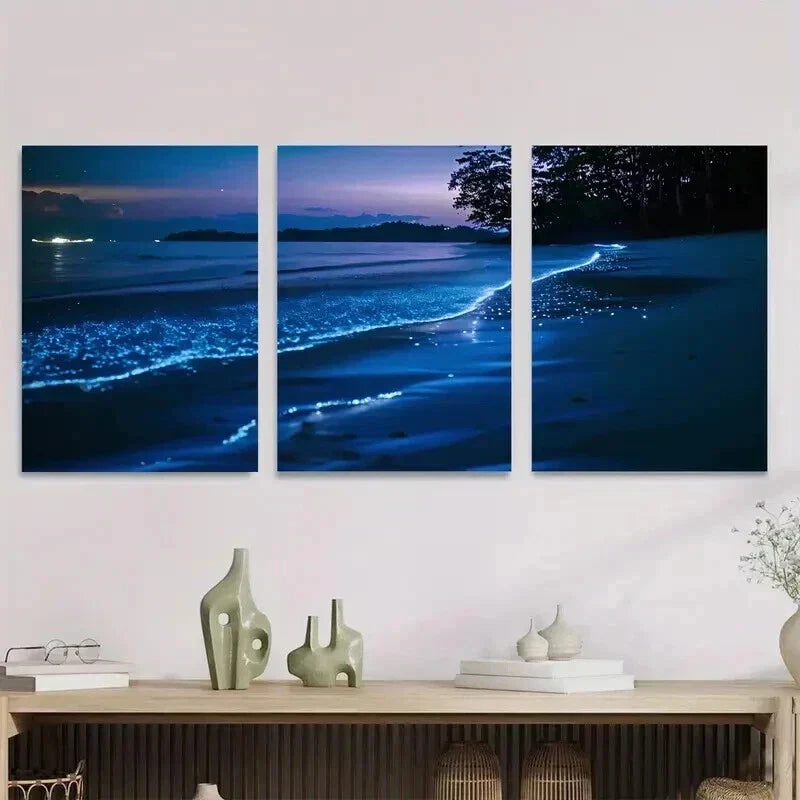 3pcs Glowing Ocean Night Scene Stunning Wall Art Set Canvas Framed 40x60cm - High Quality Print 100% Australian Made Wall Canvas Ready to Hang