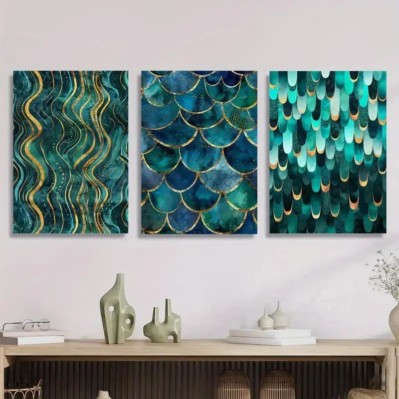 3pcs Golden and Cyan Swirl Design, Metal Print Ready to Hang Art