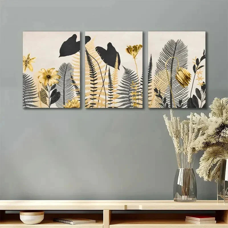 3pcs Golden & Black Foliage Design Metal Print Ready to Hang Art