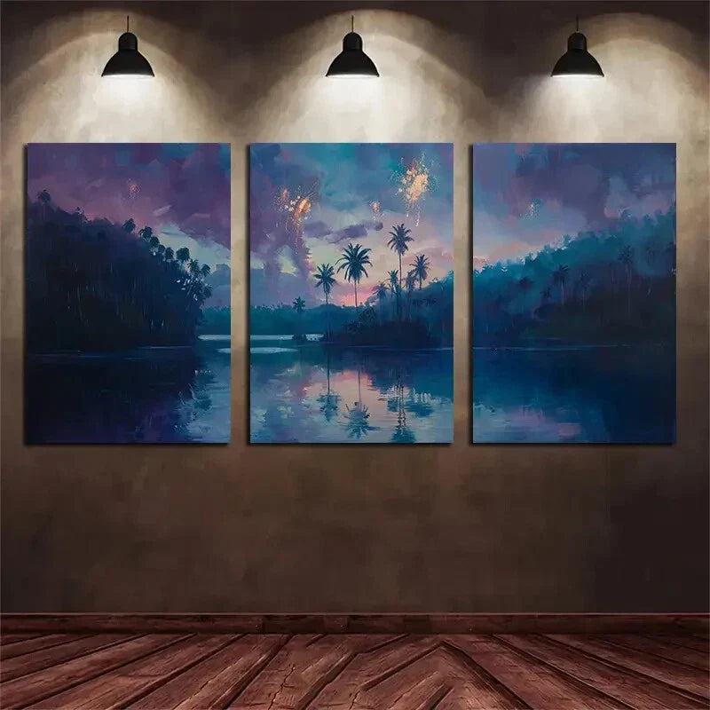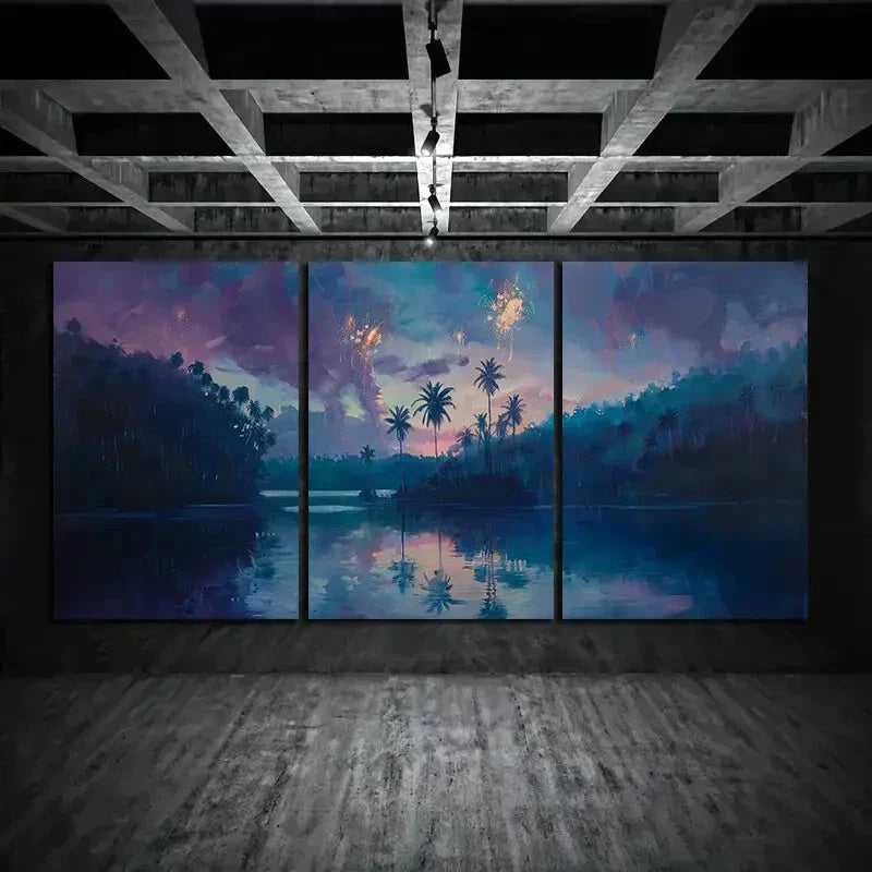 3pcs Golden Fireworks Beach and Palm Trees Metal Print Ready to Hang Art