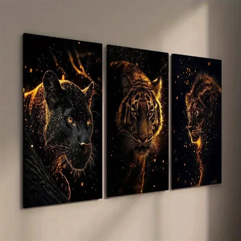 3pcs Golden Flare Lion Tiger & Panther Wall Art Set Canvas Framed 40x60cm - High Quality Print 100% Australian Made Wall Canvas Ready to Hang