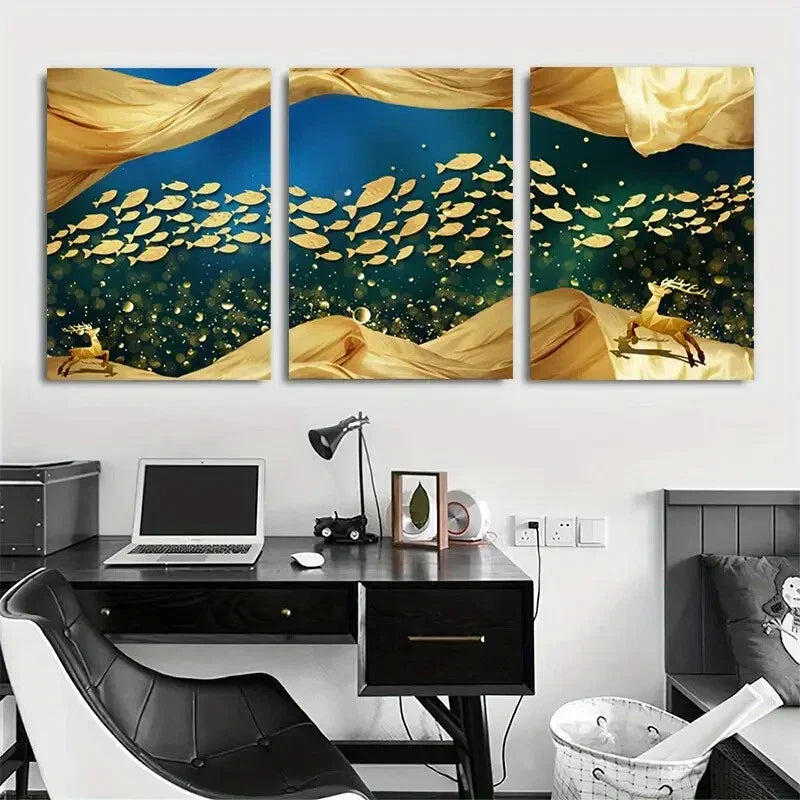 3pcs Golden Koi Fish Abstract Marine Life Metal Print Ready to Hang Art