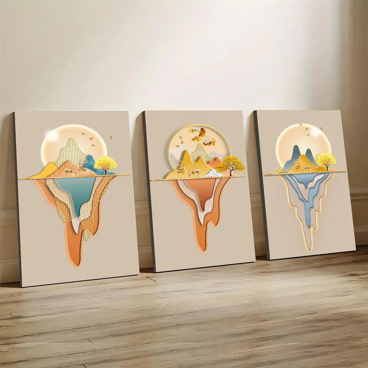3pcs Golden Leaves, Flowers & Deer Patterns with Palm Leaves Metal Print Ready to Hang Art