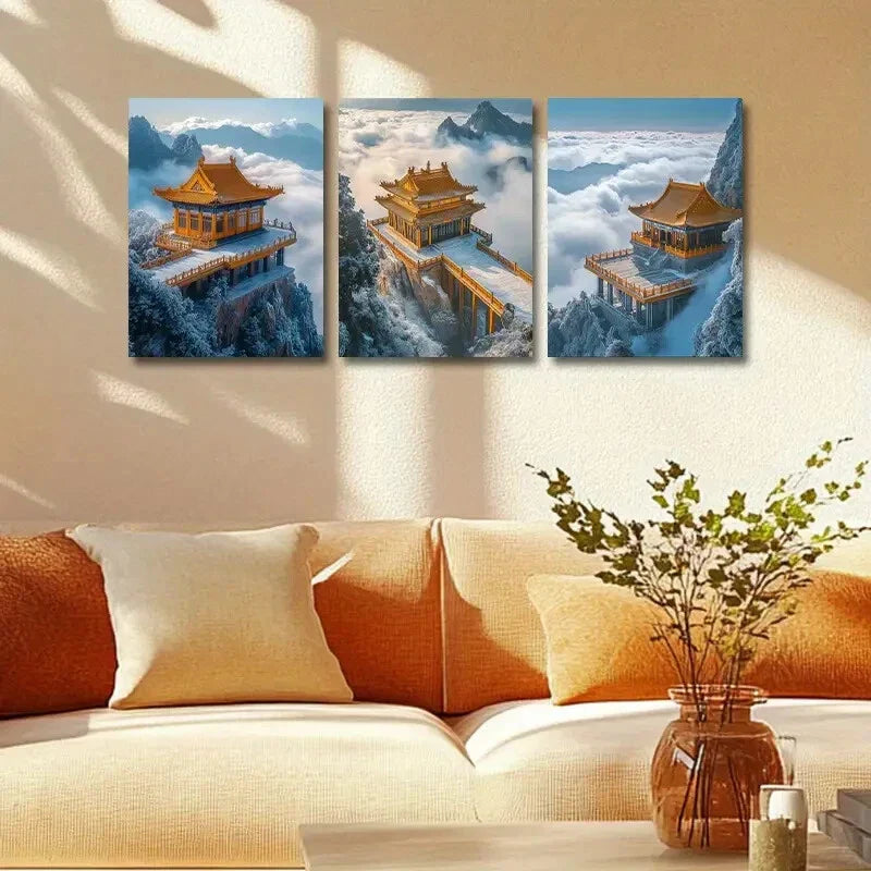 3pcs Golden Pagoda on Mountain Top with Clouds Metal Print Ready to Hang Art