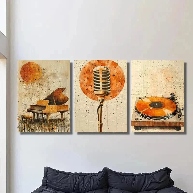 3pcs Golden Piano Microphone & Vinyl Record Wall Art Set Canvas Framed 40x60cm - High Quality Print 100% Australian Made Wall Canvas Ready to Hang