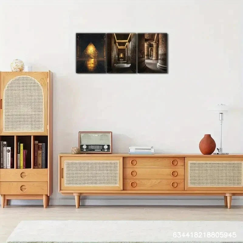 3pcs Golden Pyramid, Temple of Seti I, Metal Print Ready to Hang Art