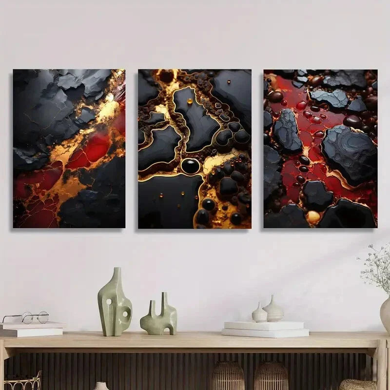 3pcs Golden red black texture art, Metal Print Ready to Hang Art