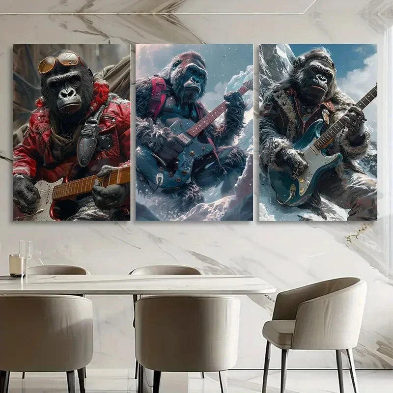 3pcs Gorilla Guitarist Red Black Blue Sky Metal Print Ready to Hang Art