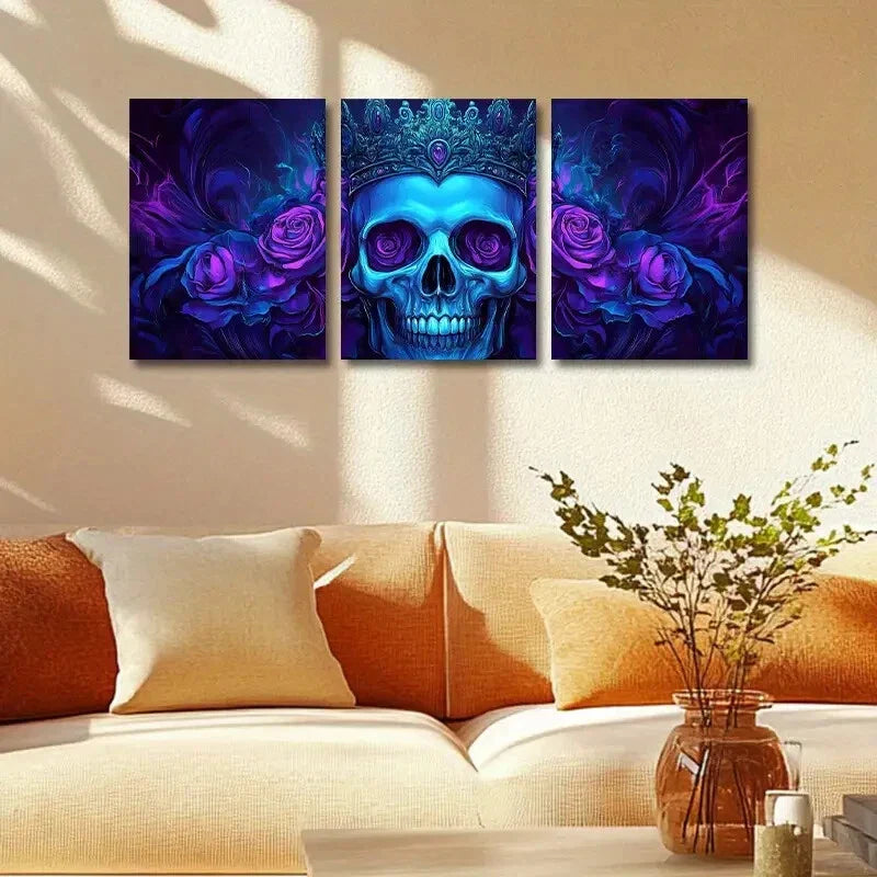 3pcs Gothic-Inspired Purple Roses & Blue Skull Metal Print Ready to Hang Art