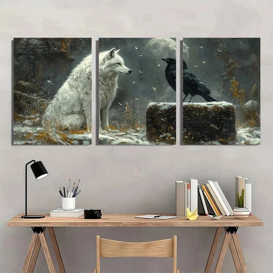 3pcs Gothic White Wolf and Crow Metal Print Ready to Hang Art