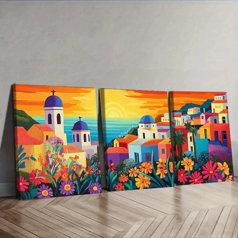 3pcs Greek island style town Wall Art Set Canvas Framed 40x60cm - High Quality Print 100% Australian Made Wall Canvas Ready to Hang