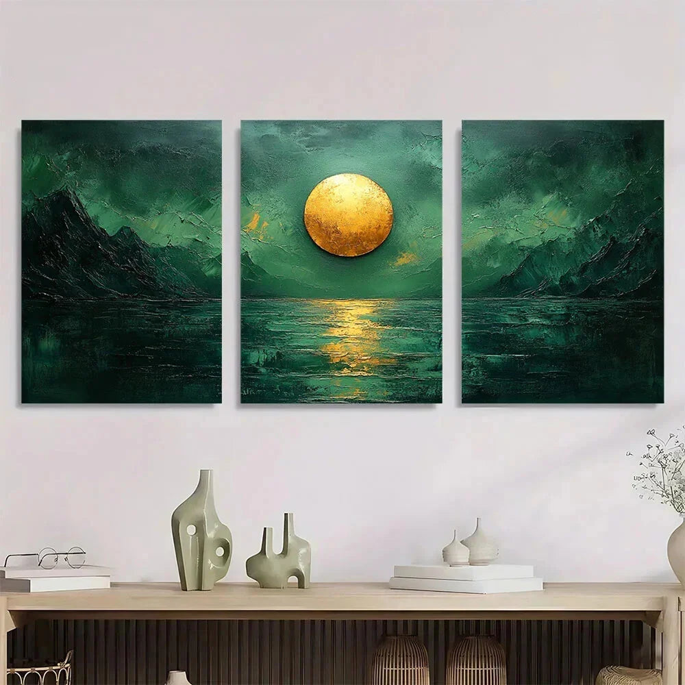 3pcs Green Abstract Mountain & Moon Metal Print Ready to Hang Art