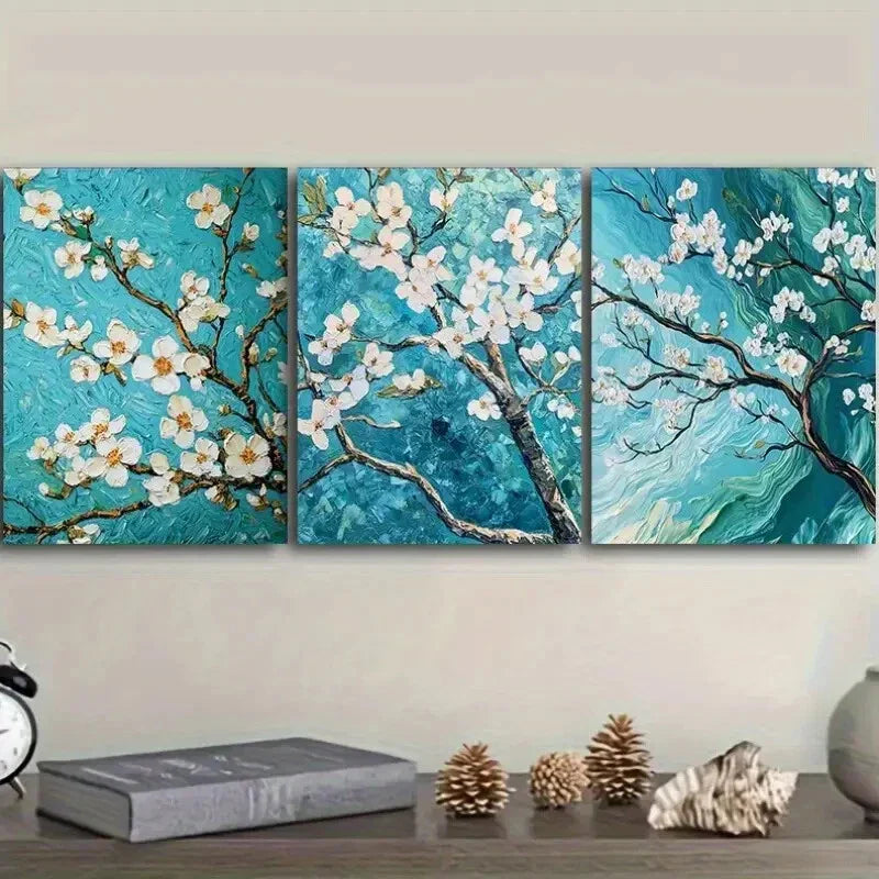 3pcs Green And White Blossoming Almond Trees Metal Print Ready to Hang Art