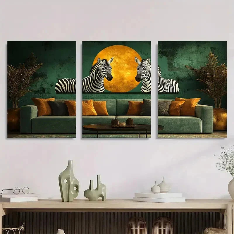 3pcs Green and White Zebras Abstract Metal Print Ready to Hang Art