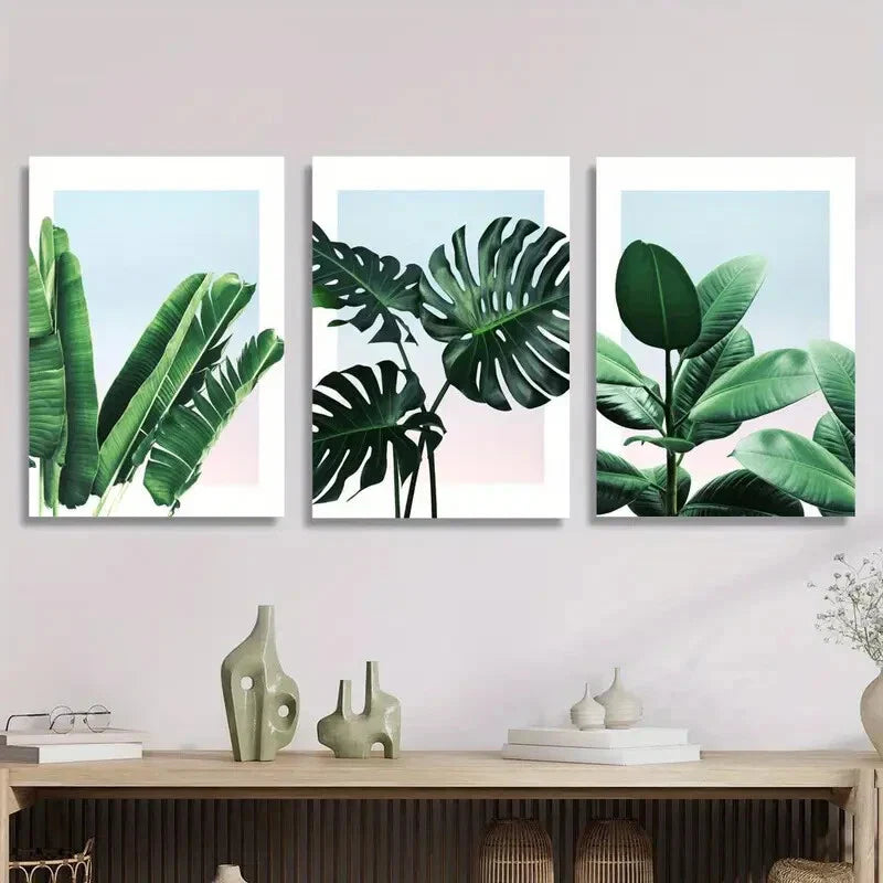 3pcs Green Leaves Plant Art Poster, Tropical Metal Print Ready to Hang Art