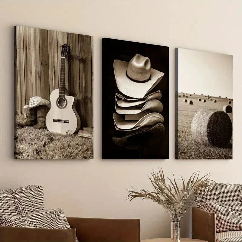 3pcs Hats & Haystacks Music Guitars Vintage Wall Art Set Canvas Framed 40x60cm - High Quality Print 100% Australian Made Wall Canvas Ready to Hang