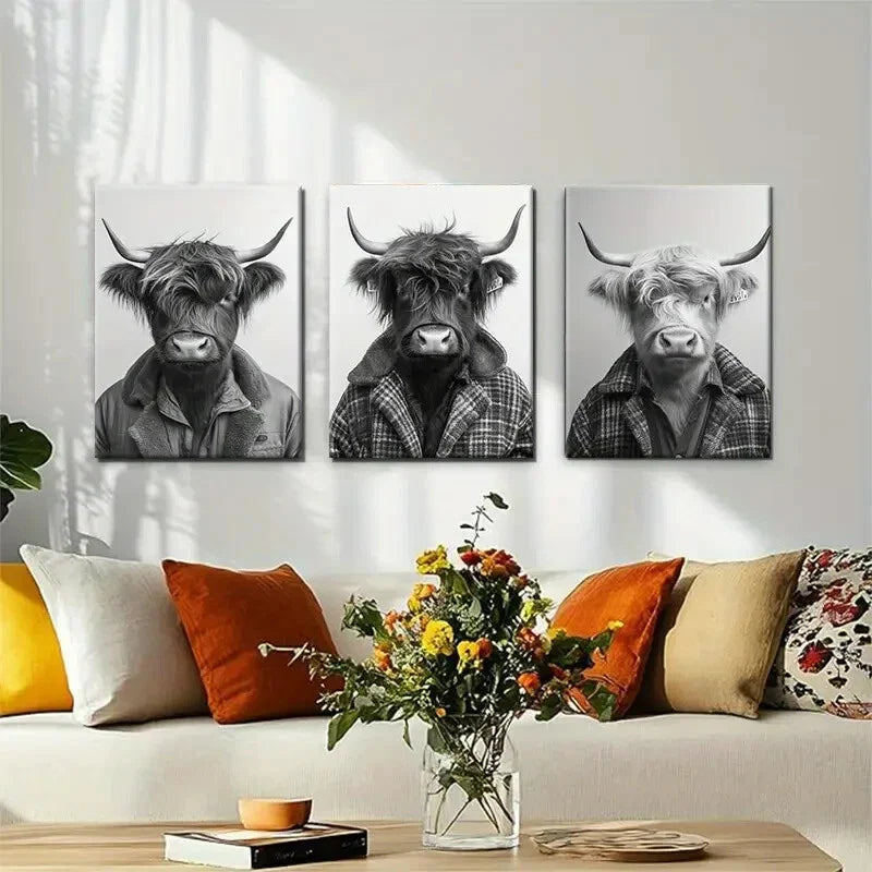 3pcs Highland Cow Portrait Fluffy Black Perfect Wall Art Set Canvas Framed 40x60cm - High Quality Print 100% Australian Made Wall Canvas Ready to Hang