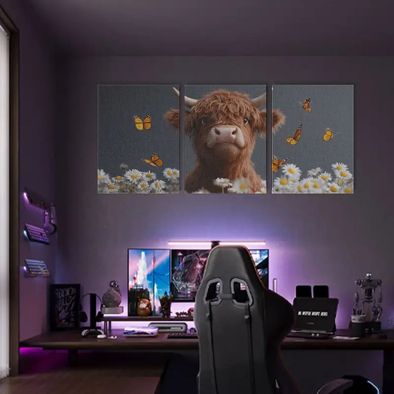 3pcs Highland Cow with Daisies & Butterflies, Whimsical Metal Print Ready to Hang Art