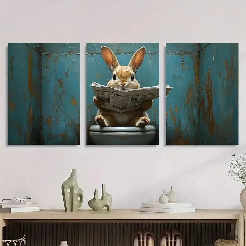 3pcs Humorous Rabbit Reading Newspaper Metal Print Ready to Hang Art