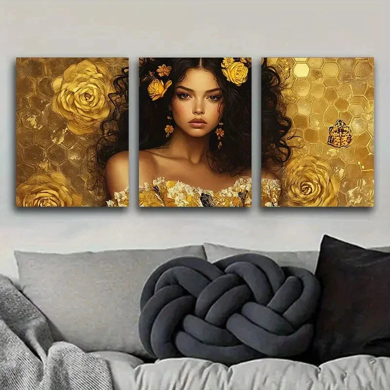 3pcs Intricate Golden lace girl Metal Print Ready to Hang Art
