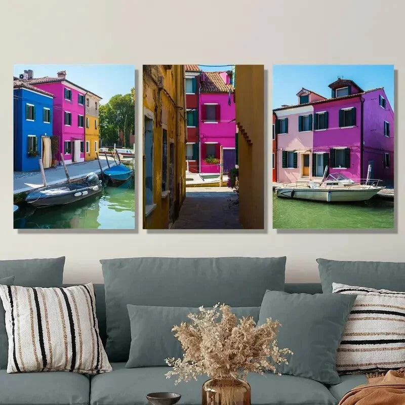 3pcs Island Canal Scene with Vibrant Buildings Metal Print Ready to Hang Art