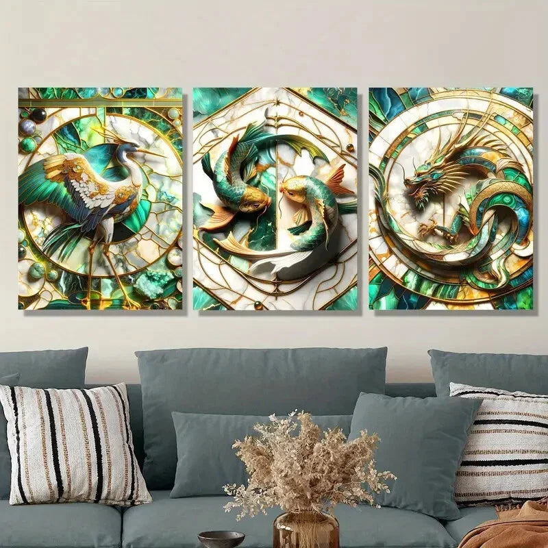 3pcs Japanese Crane, Dragon, and Koi Metal Print Ready to Hang Art