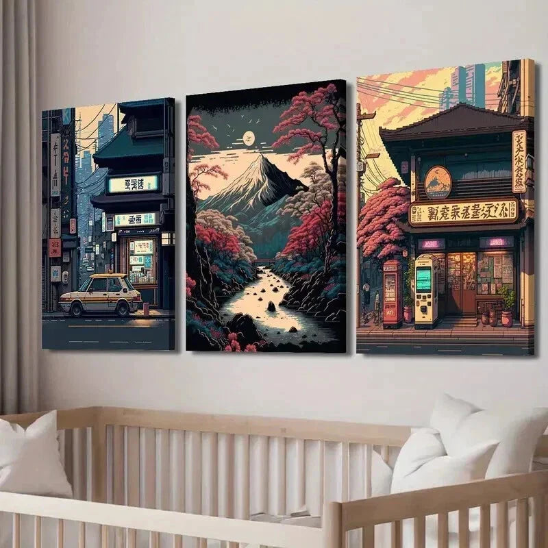3pcs Japanese Night Shop & Retro Cherry Blossom Wall Art Set Canvas Framed 40x60cm - High Quality Print 100% Australian Made Wall Canvas Ready to Hang