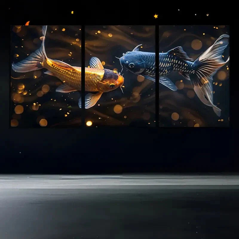 3pcs Koi Fish Modern Golden Blue Fish Metal Print Ready to Hang Art