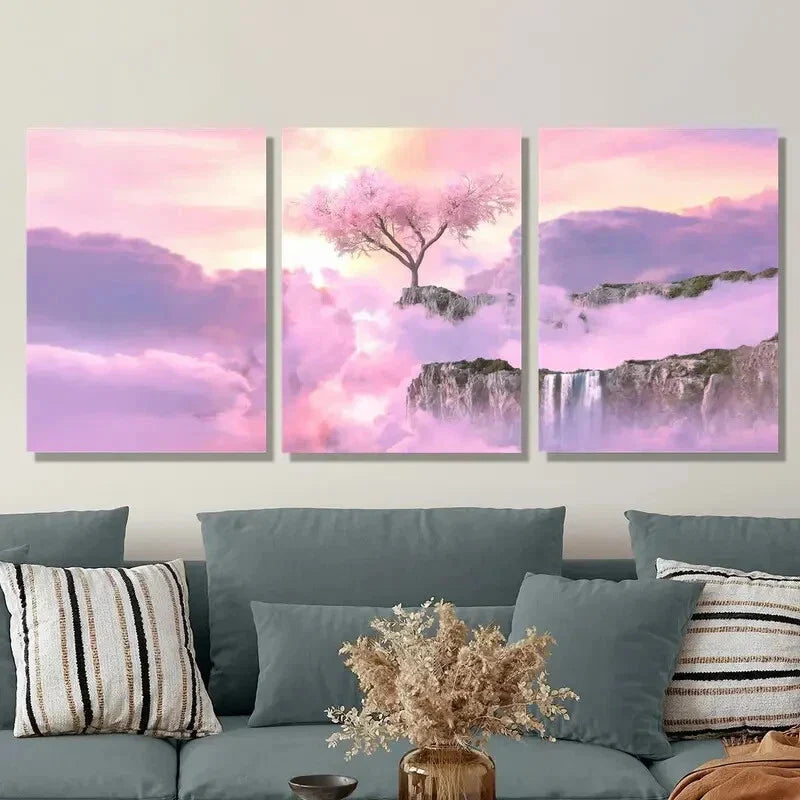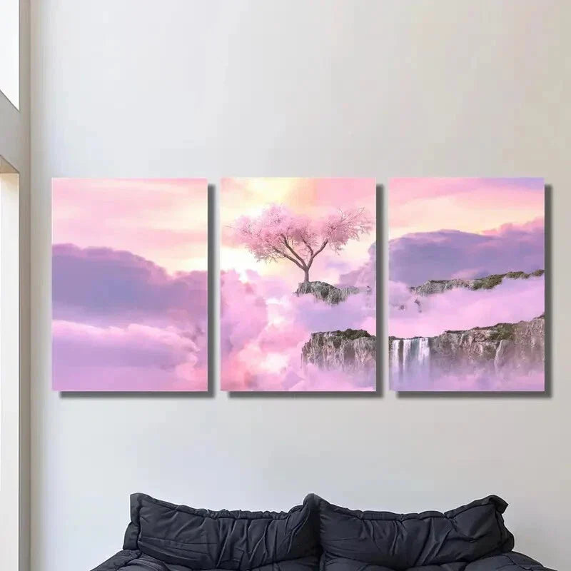 3pcs Landscape with Waterfalls Cherry Blossoms Metal Print Ready to Hang Art