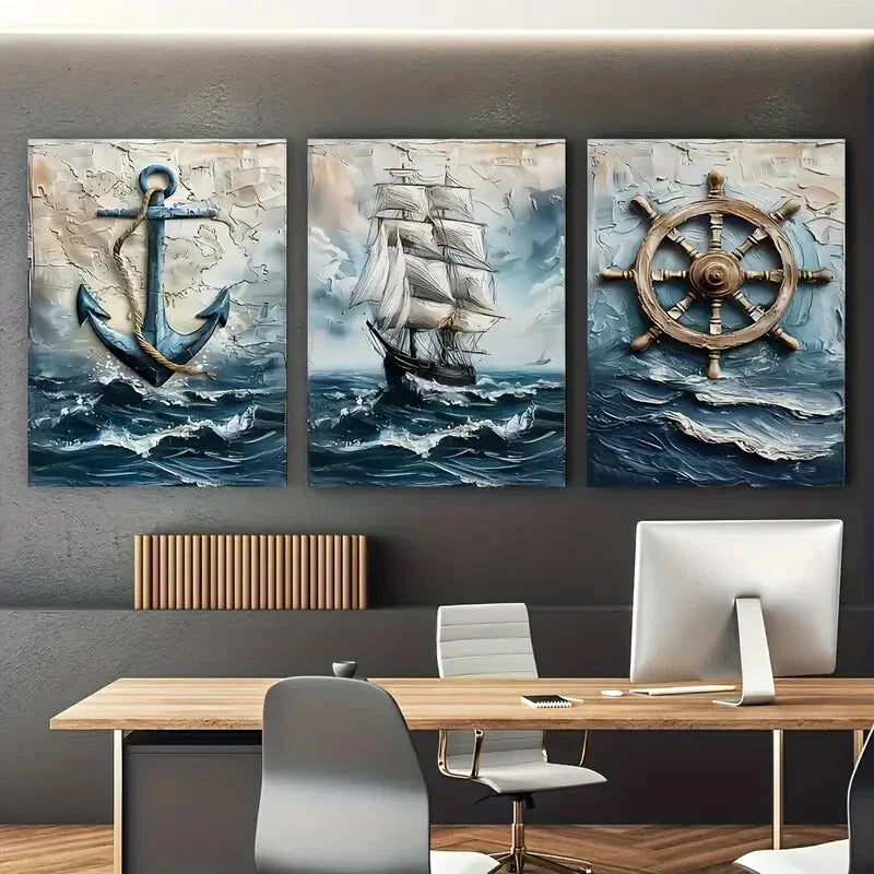 3pcs Large-Scale Sailboat & Anchor Metal Print Ready to Hang Art