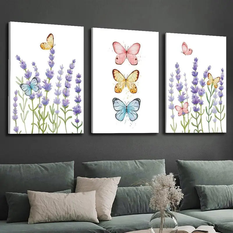 3pcs Lavender Flowers with Colorful Butterflies Metal Print Ready to Hang Art