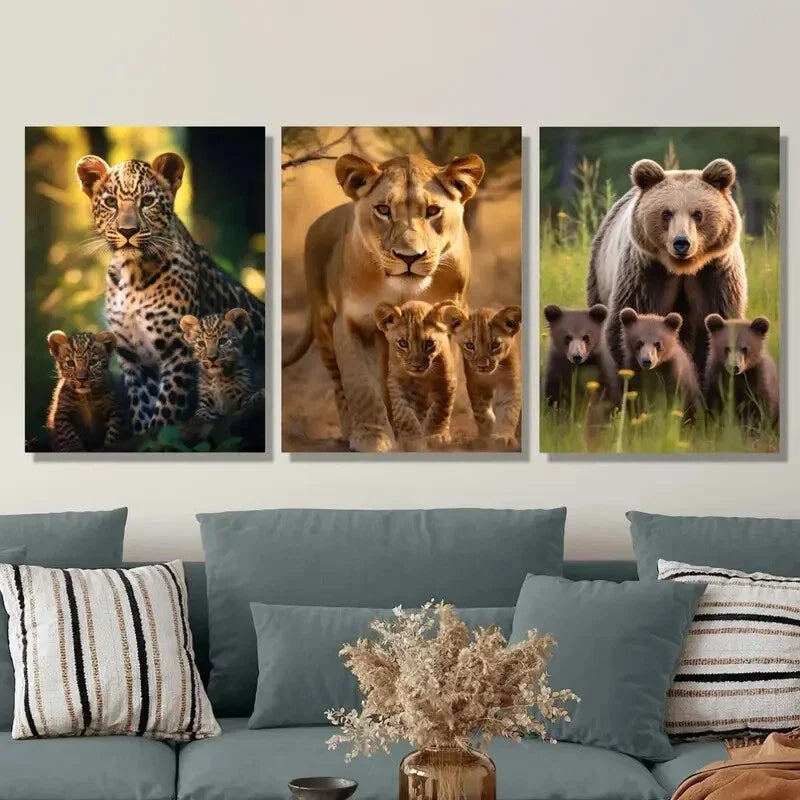 3pcs Leopard, Lioness & Cubs, Grizzly Bear Family Metal Print Ready to Hang Art