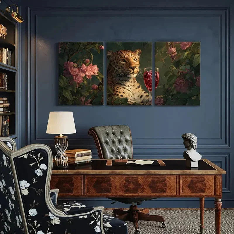3pcs Leopard with Wine Glass Floral Surroundings Metal Print Ready to Hang Art