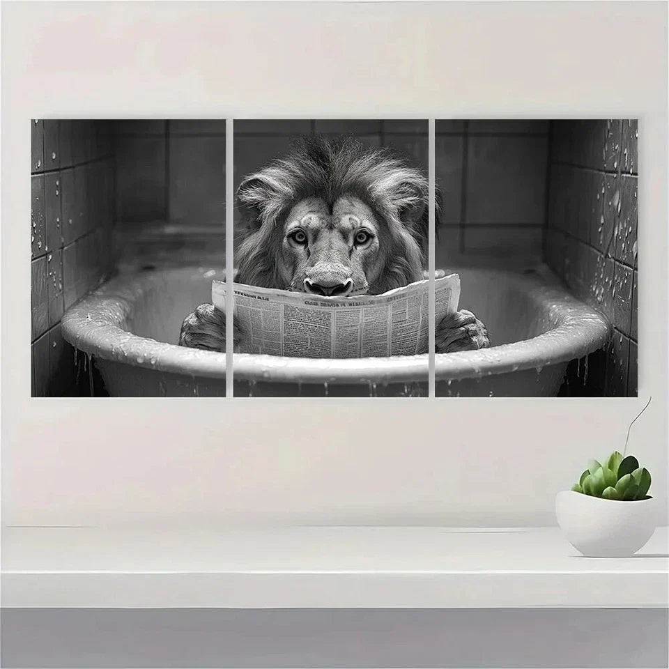 3pcs Lion Reading Newspaper Black And White Metal Print Ready to Hang Art
