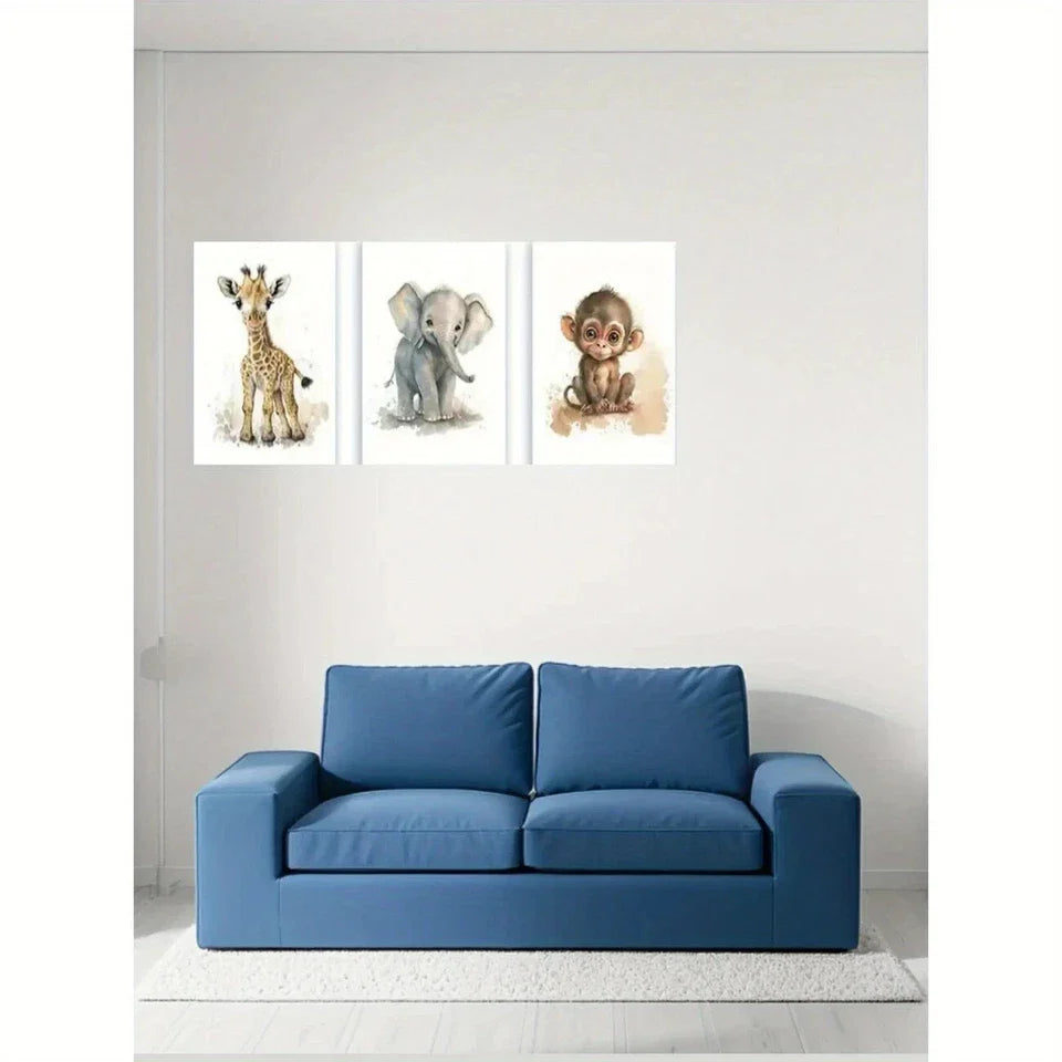 3pcs Little Monkey, Baby Elephant And Cute Giraffe Metal Print Ready to Hang Art