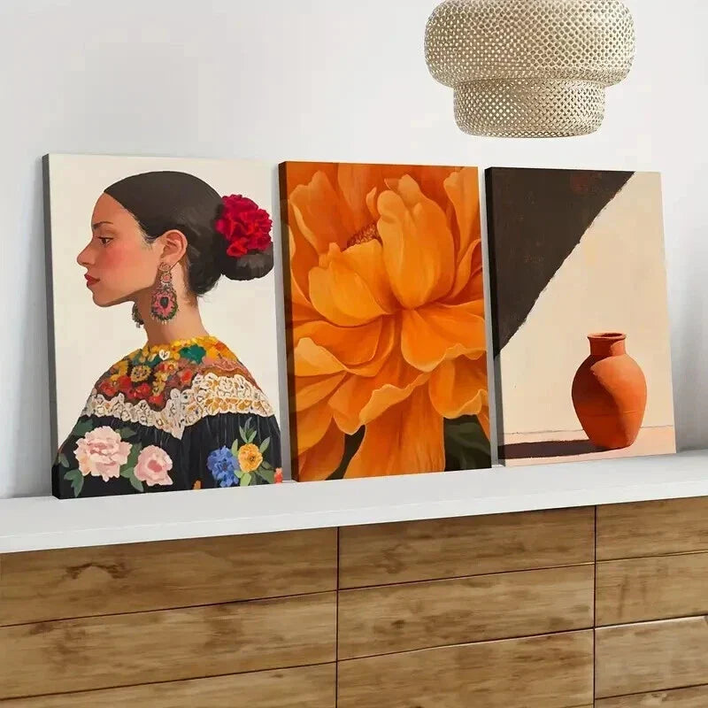 3pcs Mexican Art Marigold Mexican Woman Portrait Wall Art Set Canvas Framed 40x60cm - High Quality Print 100% Australian Made Wall Canvas Ready to Hang