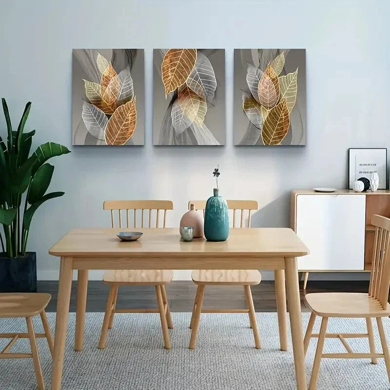 3pcs Modern Abstract Leaf Golden Blue and Gray Metal Print Ready to Hang Art