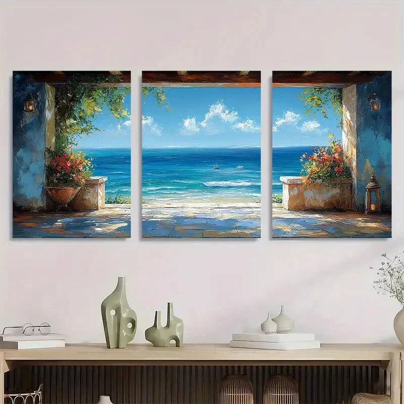 3pcs Modern Abstract Ocean View with Blue Doors Metal Print Ready to Hang Art