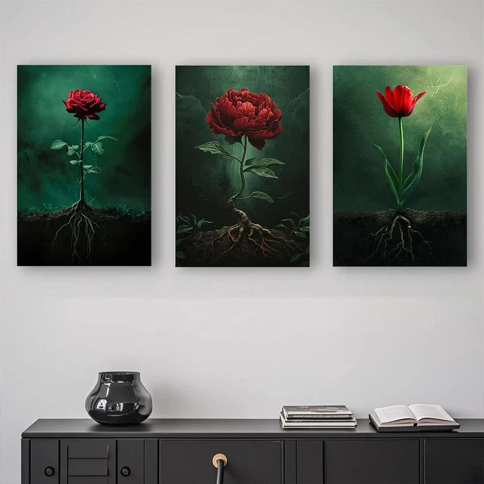 3pcs Modern Abstract Red Roses And Tulips Metal Print Ready to Hang Art