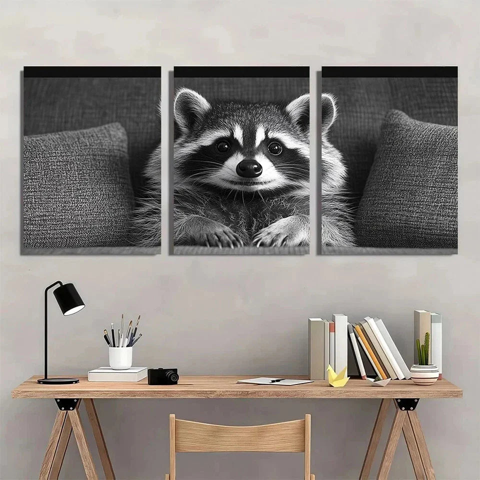 3pcs Modern Black and White Raccoon Metal Print Ready to Hang Art