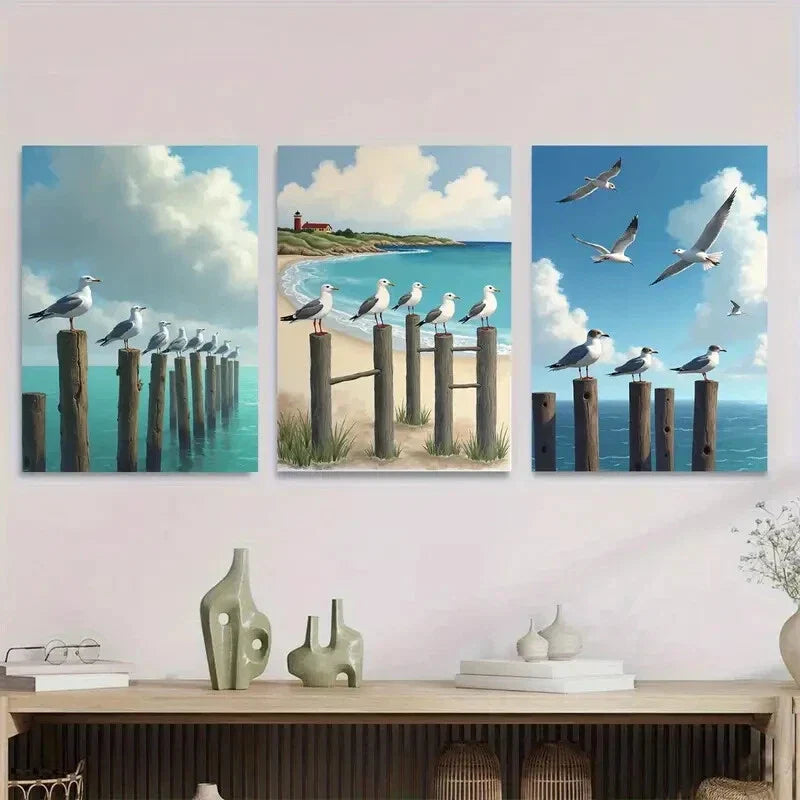 3pcs Modern Classic Beach Scene With Lighthouse Wall Art Set Canvas Framed 40x60cm - High Quality Print 100% Australian Made Wall Canvas Ready to Hang