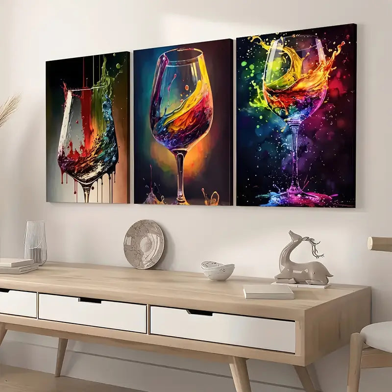 3pcs Modern Fashion Wine Glass Colorful Metal Print Ready to Hang Art